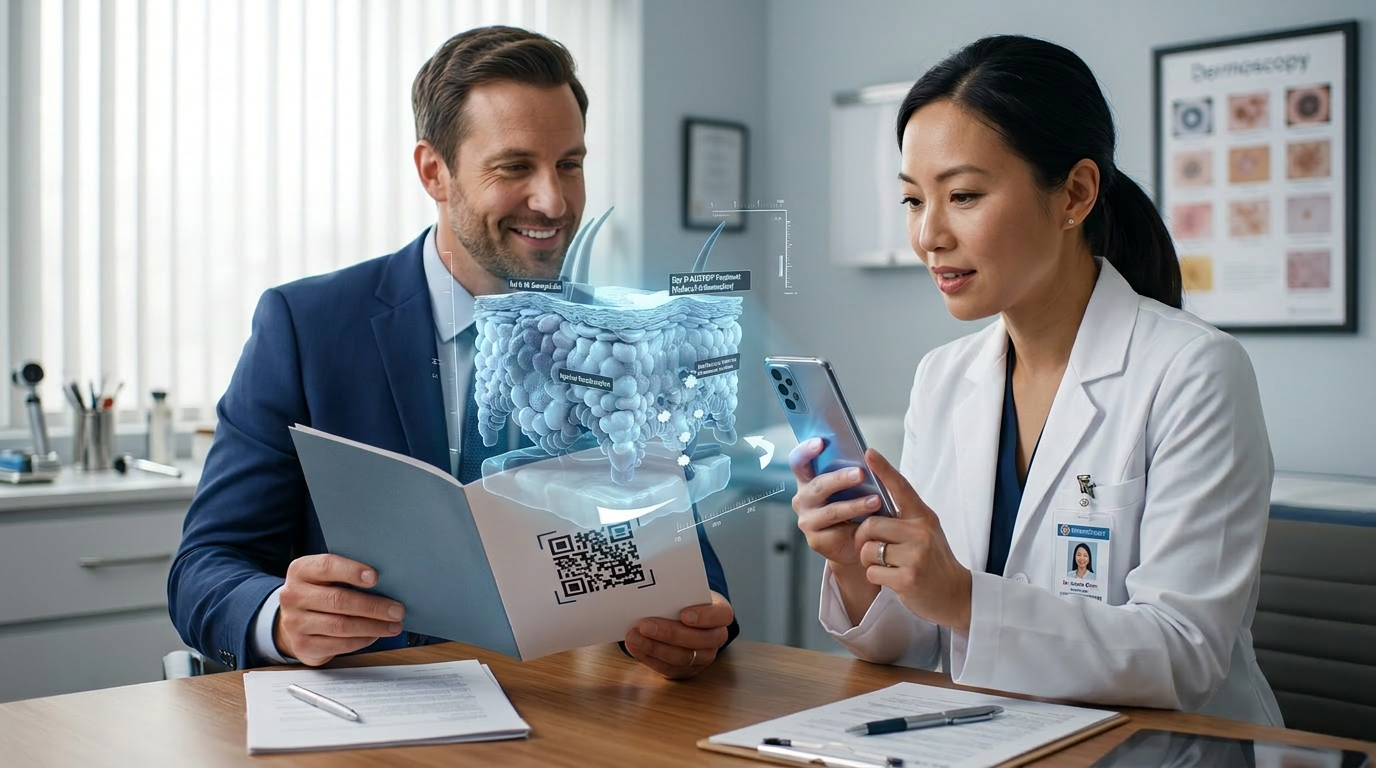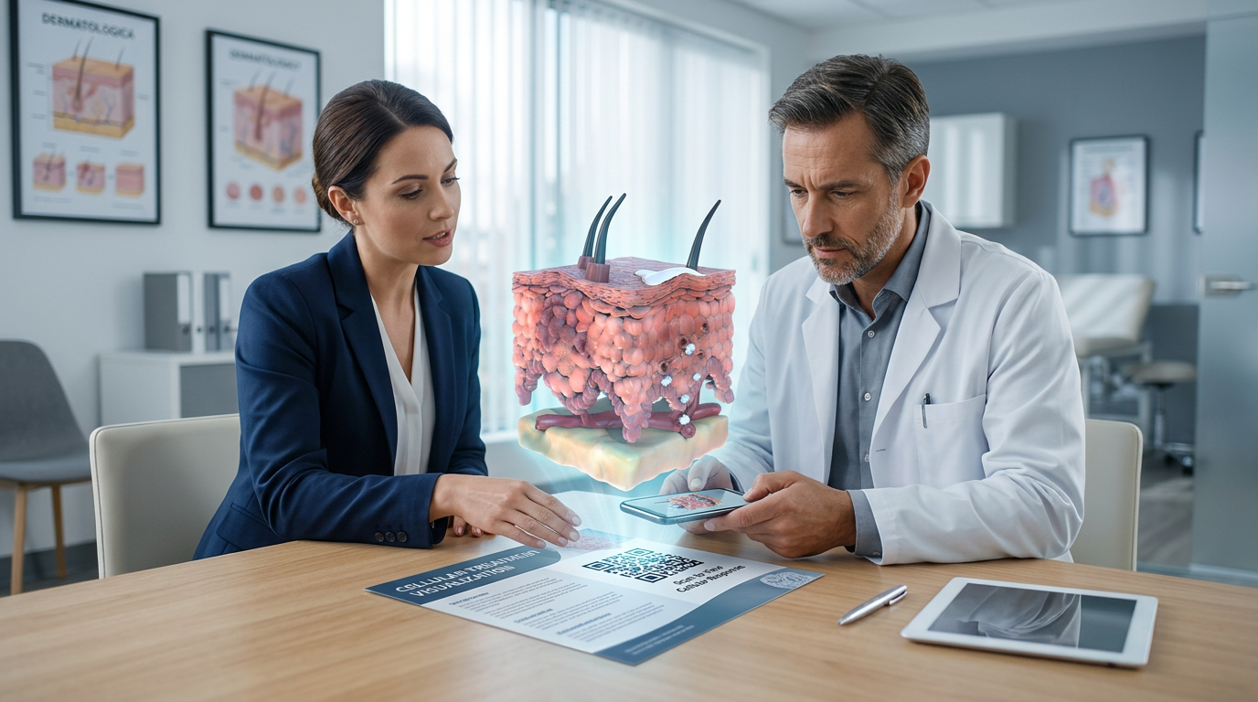 Our studio developed an interactive 3D skin model for augmented reality, allowing clinicians to explore layered anatomical changes through a guided spatial narrative.Representatives could introduce the experience during in-office visits or on conference floors, using the printed brochure as the entry point. A single scan revealed a deeper visual explanation that supported clinical discussions.