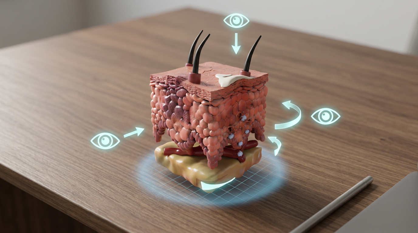 The experience centered around a responsive 3D skin environment designed for augmented viewing.Clinicians could navigate through structural layers, observing how visible changes relate to underlying biological processes.This approach bridges the gap between medical illustration, scientific storytelling, and interactive medical animation.